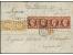 1853, Napoleon 1 fr. carmine, horizontal strip of 4, the right 2 stamps touched at base, otherwise just clear to wide margins, together with 2 good margined 10 c. bistre, tied to entire double rate le...