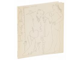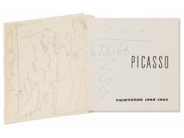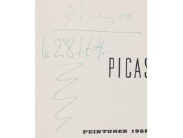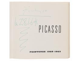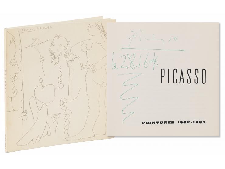 Softcover French-language catalog for an exhibition of Pablo Picasso paintings from 1962-1963, held between January 15 and February 15, 1964, at the Galerie Louise Leiris in Paris, 62 pages, 6.5 x 6.5, signed on the title page in green ballpoint, “Picasso, 28.1.64.” In fine condition.