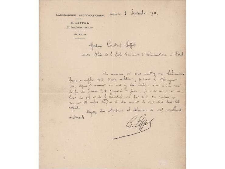 LS in French, signed “G. Eiffel,” one page, 8.25 x 9.75, personal letterhead, September 3, 1912. Letter to Mr. Courtoit-Suffit, a former student of the School of Aeronautics, Paris, in part (translated): "At the moment you are leaving my laboratory to complete your military service, I wish to testify that since the moment you entered…I have only had to praise the zeal and accuracy put by you into the works that have been entrusted to you." In fine condition.