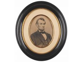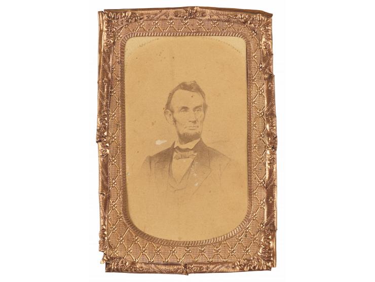 Carte-de-visite photographic portrait of Abraham Lincoln mounted in decorative foil frame, measuring 2.75˝ x 4˝ overall, circa 1864–1880. In very good condition, with some surface scuffs and wear, and some irregular bends to the foil frame.