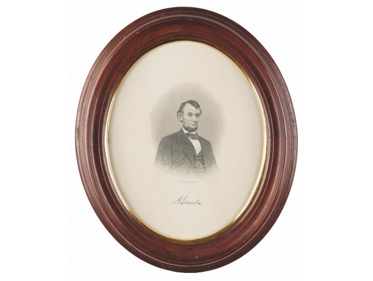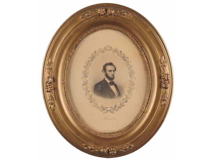 Handsome original circa 1862 engraved portrait of the bearded Abraham Lincoln by Hezekiah Wright Smith, 7.25 x 9.5, featuring the president in a bust-length pose at the center of an oval oak leaf-and-acorn surround, with his facsimile signature below. Imprinted at the bottom: "Published by Benj. B. Russell, 515 Washington St., Boston." Framed to an overall size of 12 x 14. In fine condition, with uniform toning.