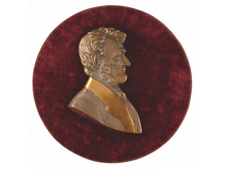 Profile likeness of Abraham Lincoln in brass relief, 5.5˝ x 7.5˝, mounted at center of a 12˝-diameter velvet-covered circular board. In very good to fine condition.