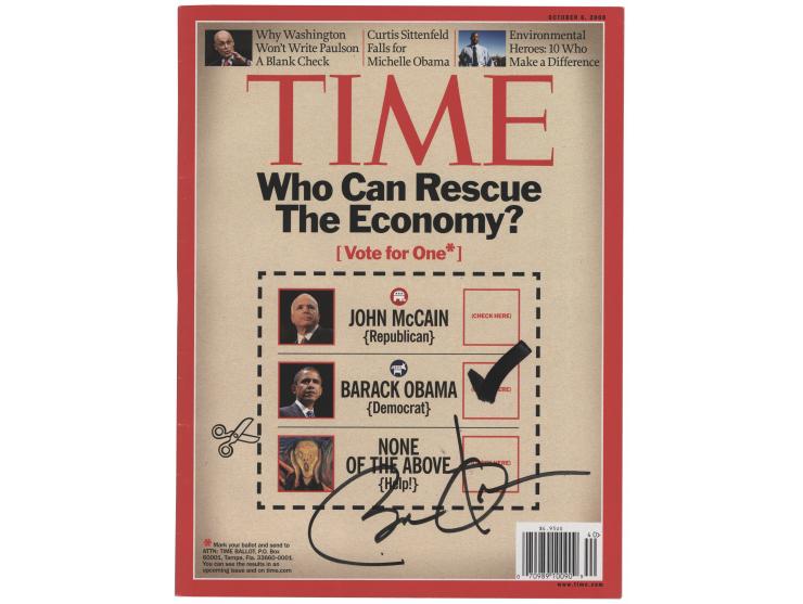 Complete issue of Time Magazine from October 6, 2008, 8 x 10.5, 84 pages, signed on the front cover in black felt tip by Barack Obama. Released a month prior to the 2008 presidential election, the cover poses the question: "Who Can Rescue The Economy?" In fine condition, with light handling wear.