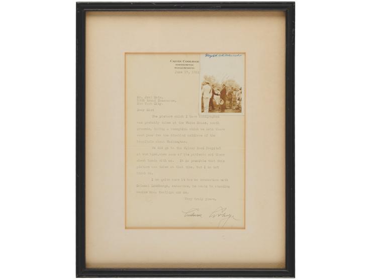 TLS, one page, 6.5 x 9.5, personal letterhead, June 17, 1932. Letter to an admirer, in part: "The picture which I have autographed was probably taken at the White House, south grounds, during a reception which we held there each year for the disabled soldiers of the hospitals about Washington…I am quite sure it has no connection with Colonel Lindbergh, otherwise, he would be standing beside Mrs. Coolidge and me." Includes the 2.5 x 3.25 photo of Coolidge meeting soldiers on the grounds, signed in fountain pen by Coolidge; another man, Floyd Whitmarsh, has signed at the top. Matted and framed together to an overall size of 11.5 x 14.5. In fine condition.