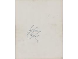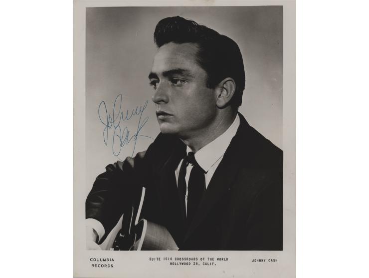 Vintage glossy 8 x 10 Columbia Records publicity photo of Johnny Cash, signed on both front and back in blue ballpoint. In very good to fine condition, with scattered creasing to his jacket, and light surface impressions from the signature on the back.