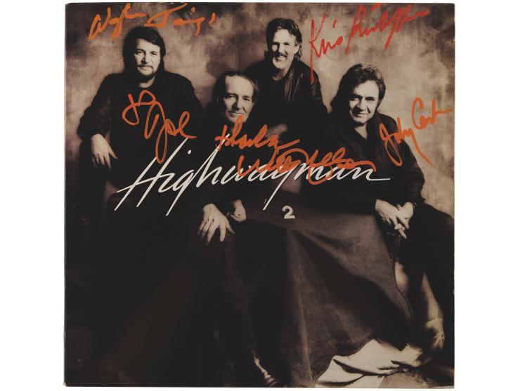 Highwayman 2 album by The Highwaymen, signed on the front cover in orange paint pen by Willie Nelson, Johnny Cash, Waylon Jennings, and Kris Kristofferson. In very fine condition. The record is included.