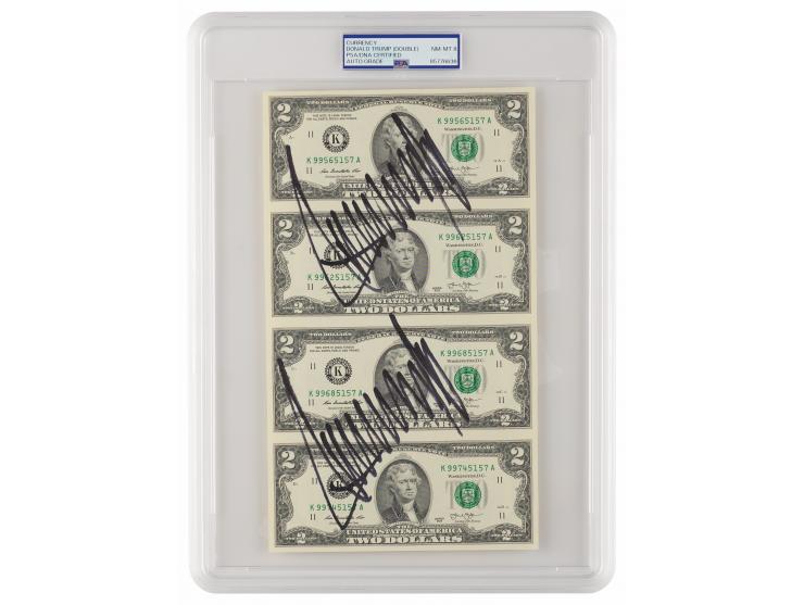 Uncut sheet of four Series 2013 two-dollar bills, signed twice on the portrait side in black felt tip by Donald Trump. In very fine condition. Encapsulated and graded by PSA/DNA as "NM-MT 8." An uncommon format boasting two large Trump signatures.