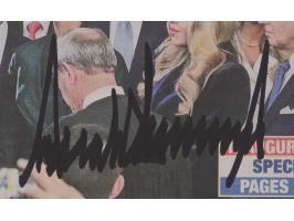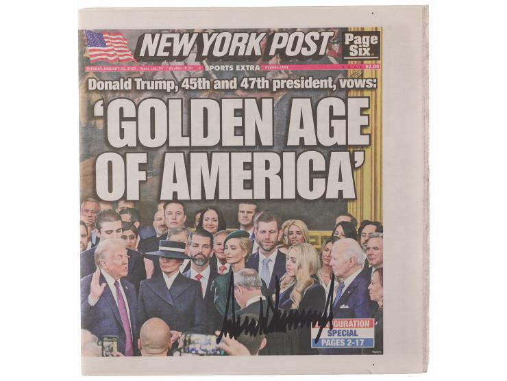 Issue of the New York Post newspaper from Tuesday, January 21, 2025, 11.5 x 12, with the front page featuring a warp-around color image of Donald Trump taking the oath of office during his second presidential inauguration, with large lead article headline, “Donald Trump, 45th and 47th president, vows: ‘Golden Age of America,’” signed prominently in black felt tip by Trump. In fine condition. Accompanied by a full letter of authenticity from PSA.