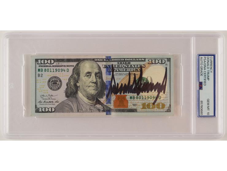 Series 2013 one-hundred-dollar bill, signed boldly on the portrait side in black felt tip by Donald Trump. In very fine condition. Encapsulated and graded by PSA/DNA as "GEM MT 10." A choice example with ideal autograph placement, not blocking the portrait of Benjamin Franklin.