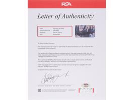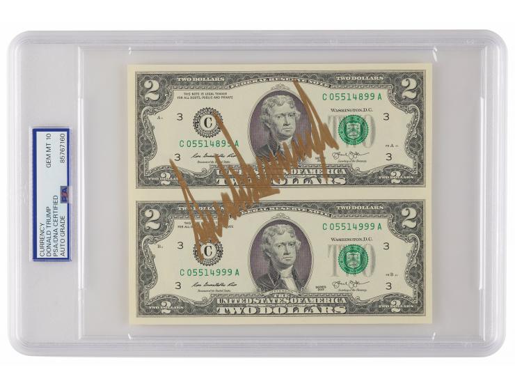 Uncut sheet of two Series 2013 two-dollar bills, prominently signed on the portrait side in uncommon gold ink by Donald Trump. In very fine condition. Encapsulated and graded by PSA/DNA as "GEM MT 10." An unusual, attractive format for Trump's autograph.