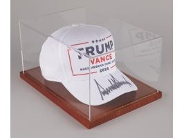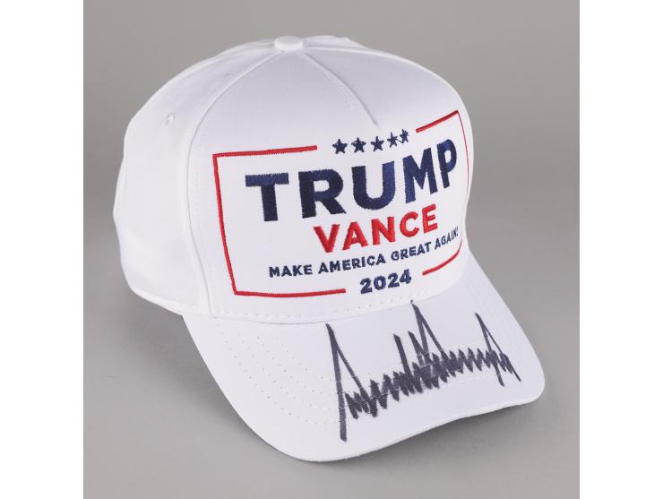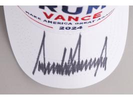White adjustable baseball cap by Cali-Fame Headwear embroidered in blue and red, "Trump/Vance, Make America Great Again! 2024," signed on the bill in black felt tip by Donald Trump. In very fine condition, with a PSA/DNA label affixed under the bill. Accompanied by a full letter of authenticity from PSA/DNA and a UV-protective acrylic display case.