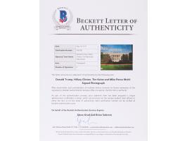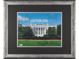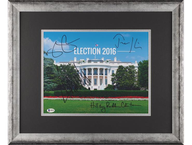 Historic color satin-finish 13.5 x 10.5 photo of the White House with "Election 2016" printed above, signed in black felt tip by the both major party tickets: Republicans Donald Trump and Mike Pence, and Democrats Hillary Rodham Clinton and Tim Kaine. Double-matted and framed to an overall size of 22.5 x 18.5. In fine condition, with a Beckett label affixed to the lower right corner. Accompanied by a full letter of authenticity from Beckett Authentication Services.