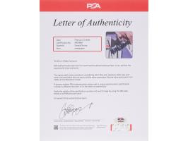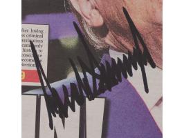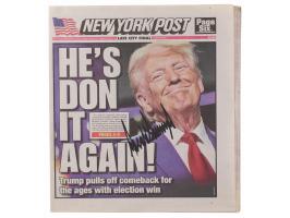 Issue of the New York Post newspaper from Wednesday, November 6, 2024, 11.25 x 12.25, with the front page featuring a color image of Donald Trump smiling smugly after winning the 2024 United States presidential election, with large lead article headline, “He’s Don It Again! Trump pulls off comeback for the ages with election win,” signed prominently in black felt tip by Trump. In fine condition. Accompanied by a full letter of authenticity from PSA.