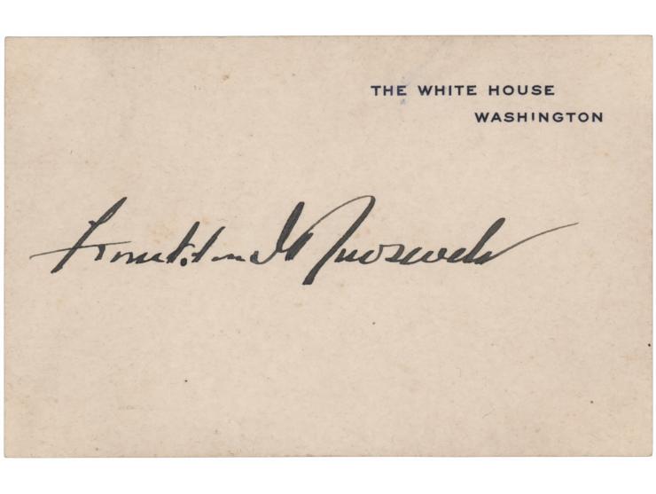 Choice official White House card, 4.25 x 2.75, boldly signed in fountain pen by Franklin D. Roosevelt. In very fine condition.