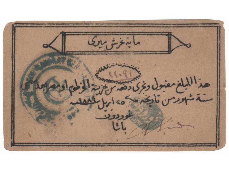 DS in Arabic, signed “C. G. Gordon,” one page, 4.25 x 2.5, no date. Promissory note from Khartoum, in part (translated): "One Hundred official Piastres, this sum is accepted and will be paid by the Treasury in Khartoum or Cairo any time six months after today." Signed at the conclusion in ink by Gordon, and slightly overstamped with his Arabic seal. In fine condition. Accompanied by a mounted portrait by the London Stereoscopic Company, featuring Gordon's facsimile signature on the mount.