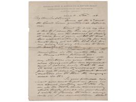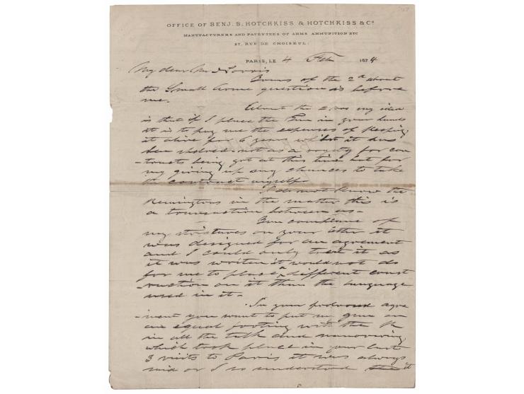 ALS signed “B. B. Hotchkiss,” three pages on two adjoining sheets, 8.25 x 10.5, Hotchkiss & Co. letterhead, February 4, 1874. Handwritten letter to "Mr. Norris" regarding a weapons contract, in part: "About the £1000 my idea is that if I place the Gun in your hands it is to pay me the expenses of keeping it alive for 6 years whilst it has been resolved—not as a royalty for contracts being got at this time but for my giving up many chances to take the contract myself. I do not know the Remingtons in the matter this is a transaction between us…In your proposed agreement you want to put my gun on an equal footing with the N in all the talk and maneuvering which took place in your last 3 visits to Paris it was always said or I so understood it." In very good to fine condition, with light creasing, minor edge wear, and a thin horizontal stain.