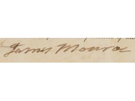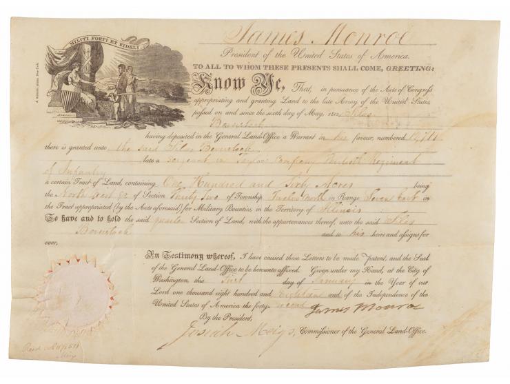 Partly-printed vellum DS as president, one page, 13 x 9.5, January 1, 1818. Desirable military land grant by which President Monroe, "in pursuance of the Acts of Congress appropriating and granting Land to the late Army of the United States," grants "Silas Beverstock, late a sergeant in Taylor Company, Thirtieth Regiment of Infantry, a certain Tract of Land, containing One Hundred and Sixty Acres." Boldly signed at the conclusion in ink by President James Monroe, and countersigned by Commissioner of the General Land Office Josiah Meigs. The white paper seal affixed at the lower left remains intact. In very good to fine condition, with some scattered light staining. Originally purchased from Walter R. Benjamin Autographs, Inc., and accompanied by its folder.