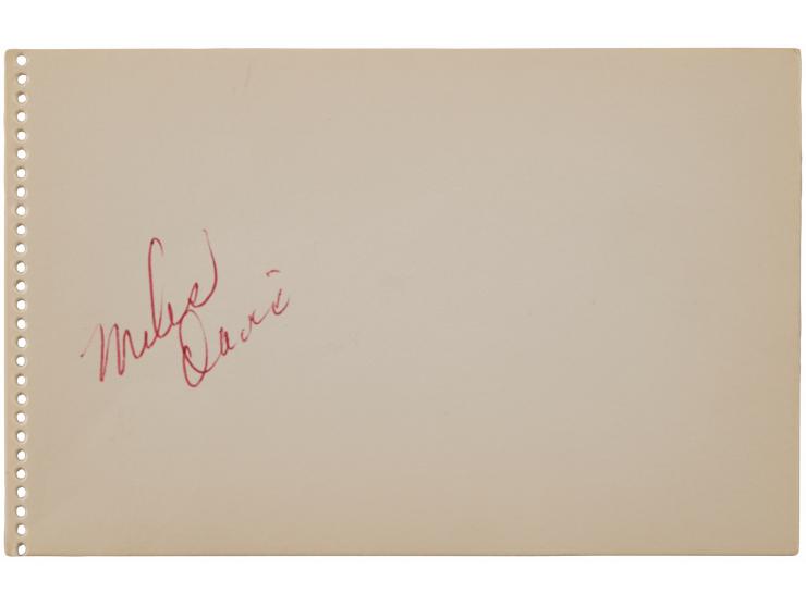 Red ballpoint signature, "Miles Davis,โ on an off-white 5 x 3.25 notebook page. In very fine condition.