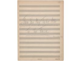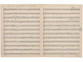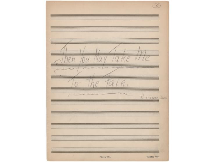 Handwritten musical manuscript in pencil by Frederick Loewe, two pages on two adjoining sheets, 9.5 x 12.5, no date but circa 1959. Loewe writes twenty-four lines of music for one of his most famous and popular songs from Camelot, "Then You May Take Me to the Fair." It is an early draft of the melody from his personal archive, written during the creation of his classic musical. Loewe also writes the title on the front, noting the singers as, "Guenevere, men." In fine condition.