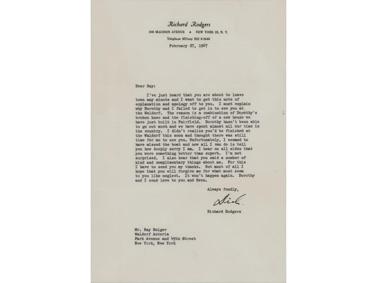 TLS signed โDick,โ one page, 7.25 x 10.5, personal letterhead, February 27, 1967. Letter to actor Ray Bolger, famed for his role as the Scarecrow in The Wizard of Oz. In part: "I've just heard that you are about to leave town any minute and I want to get this note of explanation and apology off to you. I must explain why Dorothy and I failed to get in to see you at the Waldorf. The reason is a combination of Dorothy's broken knee and the finishing-off of a new house we have just built in Fairfield. Dorothy hasn't been able to go out much and we have spent almost all our time in the country. I didn't realize you'd be finished at the Waldorf this soon and thought there was still time for me to see you. Unfortunately, I seemed to have missed the boat and now all I can do is tell you how deeply sorry I am. I hear on all sides that you were something better than superb. I'm not surprised. I also hear that you said a number of kind and complimentary things about me. For this I have to send you my thanks. But most of all I hope that you will forgive me for what must seem to you like neglect. It won't happen again." In very fine condition. Accompanied by the original transmittal envelope, sent "by messenger."