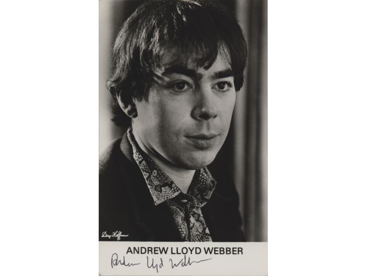 Semi-glossy 3.25 x 5.5 head-and-shoulders photo of the popular Broadway composer, signed in the lower border in black ballpoint, "Andrew Lloyd Webber." In fine condition, with a faint circular postal impression touching his left eye.