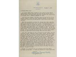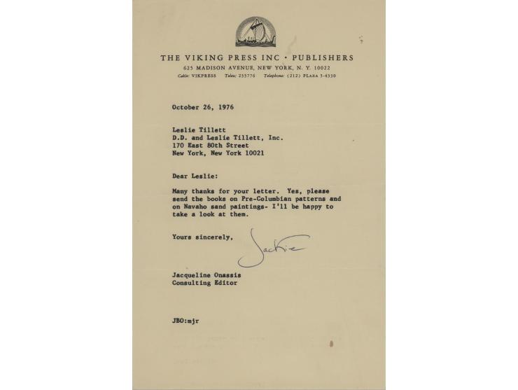 TLS signed “Jackie,” one page, 5.5 x 8.5, The Viking Press, Inc. Publishers letterhead, October 26, 1976. Letter to Leslie Tillett, in full: "Many thanks for your letter. Yes, please send the books on Pre-Columbian patterns and on Navaho sand paintings—I'll be happy to take a look at them." In fine condition. After her husband's assassination, Jackie married Aristotle Onassis and went to work as a book editor, first at Viking Press and then at Doubleday Publishing House.