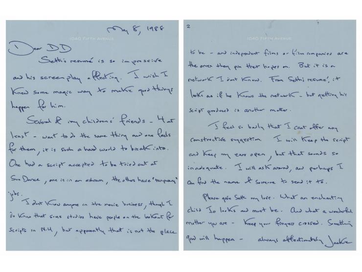 ALS signed “Jackie,” two pages, 5.75 x 7.75, personal letterhead, May 8, 1988. Handwritten letter to D. D. Tillett, in full: "Seth's resumé is so impressive and his screenplay affecting. I wish I knew some magic way to make good things happen for him. Several of my children's friends—4 at least—want to do the same thing and one feels for them, it is such a hard world to break into. One had a script accepted to be tried out at Sun Dance, one is in an ashram, the others have 'temporary' jobs. I don't know anyone in the movie business, though I do know that some studios have people on the lookout for scripts in N.Y., but apparently that is not the place to be—and independent films or film companies are the ones they pin their hopes on. But it is a network I don't know…I feel so badly that I can't offer any constructive suggestion. I will keep the script and keep my ears open, but that sounds so inadequate. I will ask around, and perhaps I can find the name of someone to send it to." In very fine condition. Accompanied by the original mailing envelope, addressed in Kennedy's own hand.