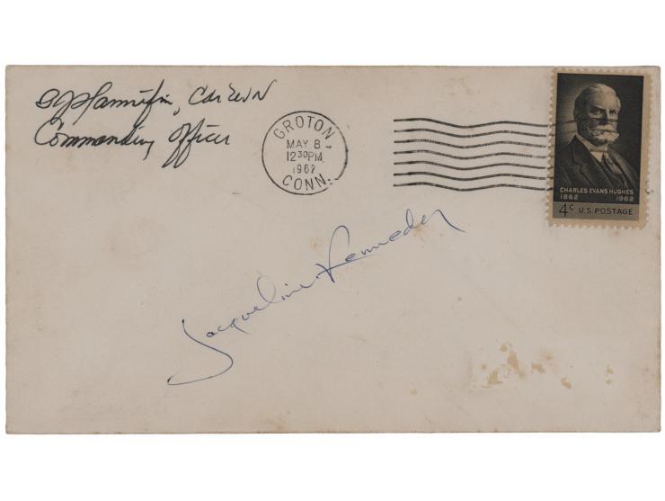 Postal cover with an affixed stamp honoring Supreme Court justice Charles Evans Hughes, canceled at Groton, Connecticut, on May 8, 1962, signed in blue ballpoint by Jacqueline Kennedy. Also signed in the upper left corner in fountain pen by a naval officer. In fine condition, with a small area of label remnants in the address area.
