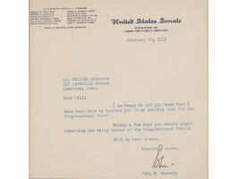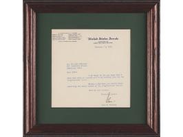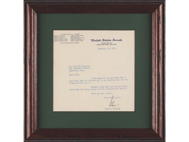 TLS as a Massachusetts senator, signed “John,” one page, 6.5 x 6.5, United States Senate letterhead, February 27, 1953. Letter to William McConnor, in full: “I am happy to let you know that I have been able to include you on my mailing list for the Congressional Record. Within a few days you should start receiving the daily issues of the Congressional Record.” Matted and framed to an overall size of 11.25 x 11.25. In fine condition. Accompanied by a full letter of authenticity from JSA.