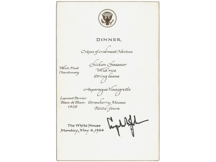 Official gilt-edged menu from a White House state dinner on Monday, May 4, 1964, 4.25 x 6.5, stamped in gilt with the presidential seal, signed in black felt tip by Lyndon B. Johnson. In very fine condition.