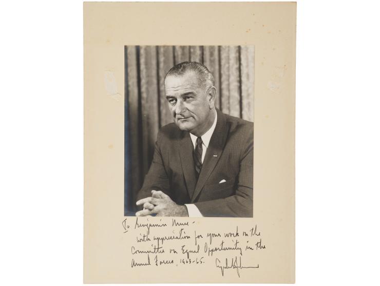 Vintage matte-finish 5.5 x 7.25 photo of Johnson in a suit and tie, affixed to a 9 x 12 mount, signed and inscribed on the mount in fountain pen, "To Benjamin Muse—with appreciation for your work on the Committee on Equal Opportunity in the Armed Forces, 1963–65. Lyndon B. Johnson.” In very good to fine condition, with scattered light foxing, and two small areas of surface loss, to the mount.