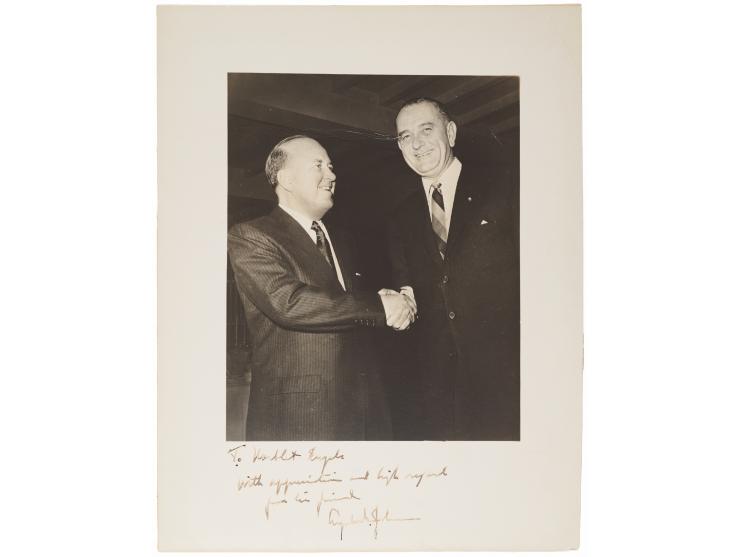 Vintage matte-finish 10.75 x 14 photo of Johnson shaking hands, signed and inscribed in the lower border in fountain pen, "To Norblet Engels, with appreciation and high regard from his friend, Lyndon B. Johnson.” Affixed to a same-size mount and in very good to fine condition, with creasing at the top, crossing Johnson's face.