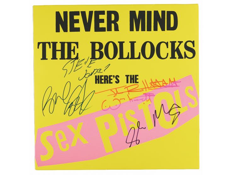 Never Mind the Bollocks, Here's the Sex Pistols album signed on the front cover in red felt tip by Johnny Rotten, in black felt tip by Glen Matlock, and in blue felt by Steve Jones and Paul Cook. In very fine condition. The record is included.