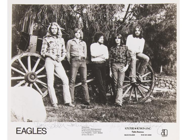 Vintage glossy 9.75 x 8 Asylum Records publicity photo of the Eagles posing together near a large carriage or wagon, signed in the lower border in ballpoint by Don Felder, Joe Walsh, Don Henley, Randy Meisner, and Glenn Frey. In fine condition, with some minor ink adhesion issues. The consignor notes that they received this photograph from an aunt who was a cousin of Glenn Frey.
