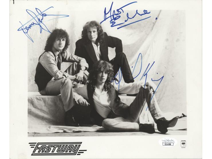 Uncommon glossy 10 x 8 Columbia Records publicity photo of English hard rock band Fastway, signed in blue felt tip by original band members ‘Fast’ Eddie Clarke, Dave King, and Jerry Shirley. In fine condition, with a tiny tear to the top edge, some small surface impressions, and a JSA label affixed to the lower right corner. Accompanied by a certificate of authenticity from JSA.