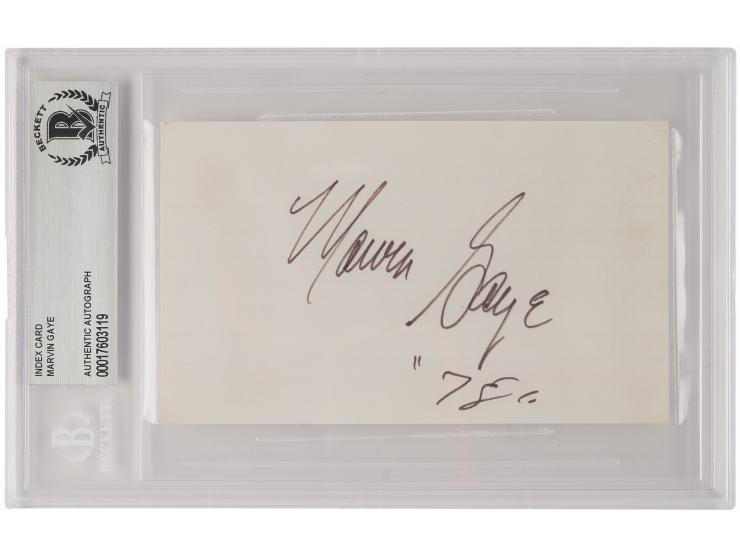 Vintage felt tip signature, "Marvin Gaye, '78,'” on a white 5 x 3 card. In very fine condition. Encapsulated in a Beckett authentication holder.