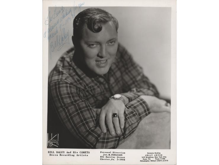Vintage glossy 8 x 10 Decca Records publicity photo of the frontman for Bill Haley and His Comets by James J. Kriegsmann, signed and inscribed in blue ballpoint, “To George, a pleasure working for you, March 7–1956, Bill Haley.” In fine condition.