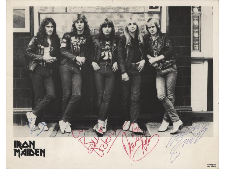 Vintage glossy 10 x 8 promotional photo for heavy metal greats Iron Maiden, signed in red ink by Bruce Dickinson and Dave Murray, and in ballpoint by Adrian Smith and Steve Harris. In very good to fine condition, with several light vertical creases.