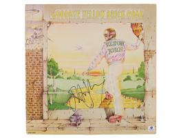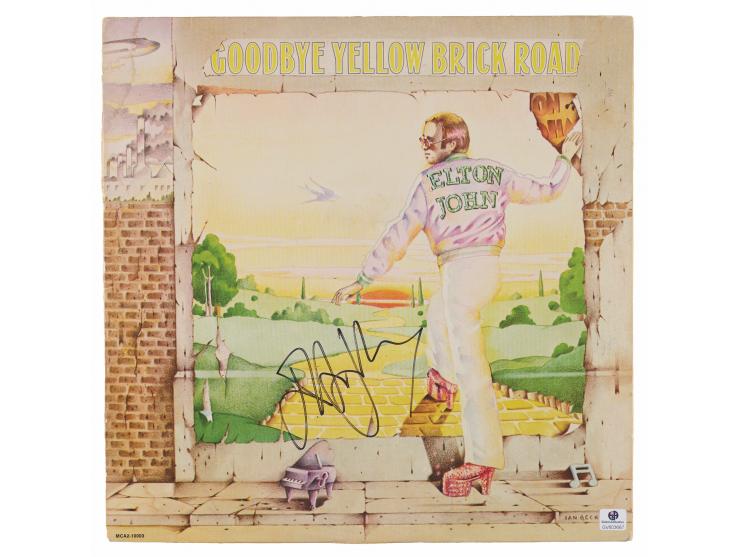Goodbye Yellow Brick Road album by Elton John, signed on the front cover in black felt tip. In fine condition, with an authenticity label affixed to the lower right corner. Accompanied by a full letter of authenticity from REAL.