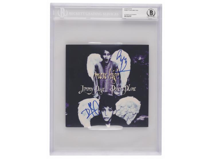Mercury Records 45 RPM record sleeve for the Page/Plant single 'Most High,' signed in blue felt tip by Jimmy Page and Robert Plant. In very fine condition. Encapsulated in a Beckett authentication holder. The record is not included.