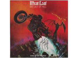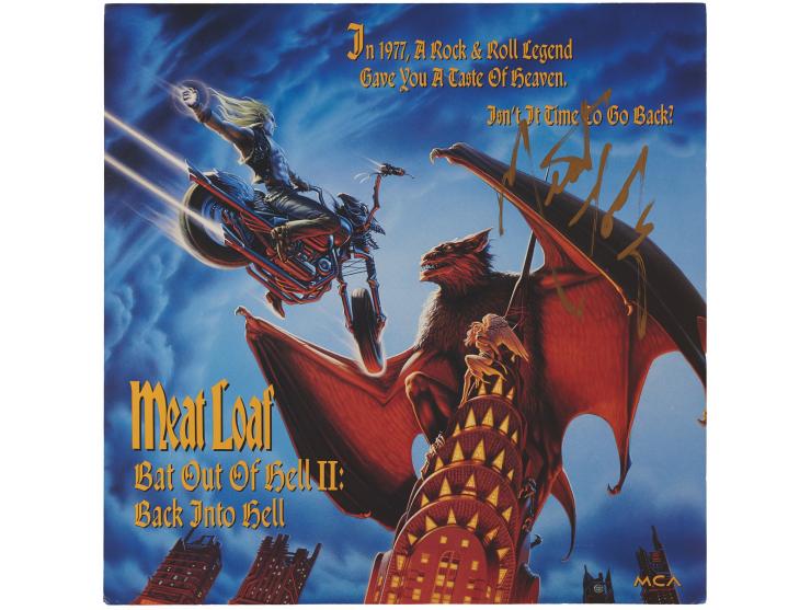Two items: Bat Out of Hell album signed on the front cover in black felt tip by Meat Loaf; and an album flat for the 1993 Meat Loaf album Bat Out of Hell II: Back into Hell, signed on the front in gold ink. In overall fine condition. The Bat Out of Hell record is included. Accompanied by a certificate of authenticity from JSA for Bat Out of Hell.