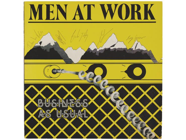 Business as Usual promotional album by Men at Work, signed on the front cover in black ballpoint by original band members Greg Ham, John Rees, Colin Hay, Jerry Speiser, and Ron Strykert. In fine condition. The record is not included.