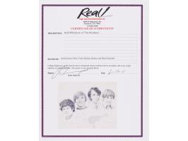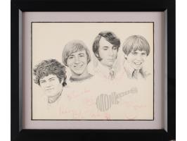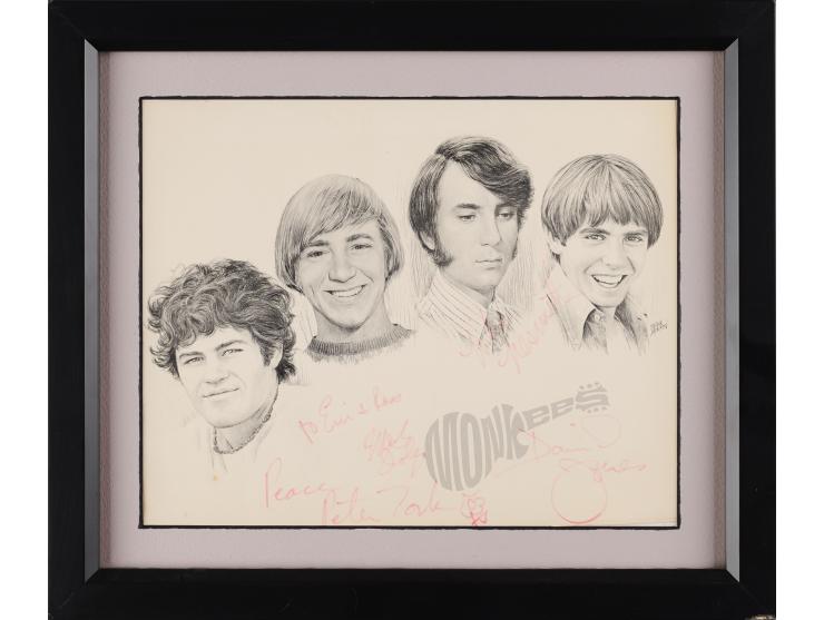 Glossy 9.75 x 7.75 photo of Frank Morton's artistic portrait of The Monkees, signed and inscribed in red felt tip, "To Eric & Ross, Mickey Dolenz," "David Jones," "Peace, Peter Tork," and "Mike Nesmith.” Matted and framed to an overall size of 13.25 x 11.25. In fine condition, with uniform fading to all four signatures. Accompanied by a full letter of authenticity from REAL.