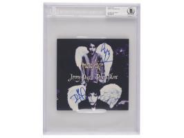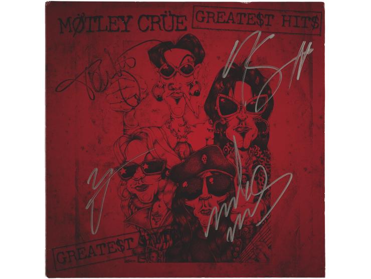 Greatest Hits compilation album by Mötley Crüe, signed on the front cover in silver ink by Vince Neil, Mick Mars, and Nikki Sixx, and in black felt tip by Tommy Lee. In fine condition. The record is not included. Accompanied by full letters of authenticity from REAL and Beckett Authentication Services.