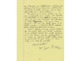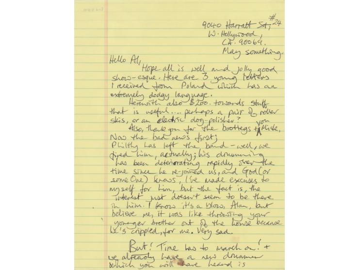 ALS signed “Lem K,” two pages, 8.5 x 11, “May something” [1992]. Addressed from West Hollywood, a handwritten letter from Motorhead frontman Lemmy Kilmister, which he sent to Alan Burridge, manager of the band’s UK fan club. The letter covers various topics, including the sacking of the band’s drummer, Phil ‘Philthy Animal’ Taylor, and the hiring of the group’s new drummer, Mikkey Dee. It reads, in part: “Hope all is well and jolly good show-esque. Here are 3 young letters I received from Poland which has an extremely dodgy language. Herewith also $200 towards stuff that is useful…perhaps a pair of roller skis, or an electric dog-polisher? Also, thank you for the bootlegs + you Mick. Now the bad news first;
