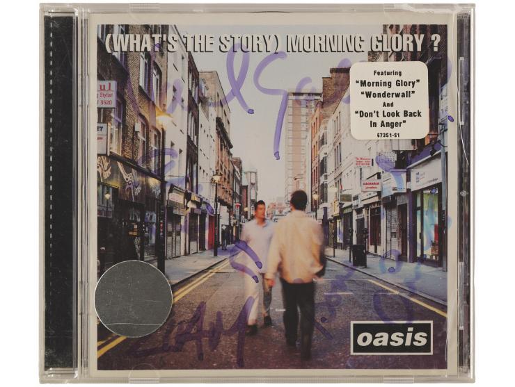 (What's the Story) Morning Glory? CD signed on the front of the booklet in blue felt tip by Liam Gallagher, Noel Gallagher, Paul 'Bonehead' Arthurs, Paul 'Guigsy' McGuigan, and Alan 'Whitey' White. In fine condition, with fading to ink. The CD is included. Accompanied by a full letter of authenticity from REAL.