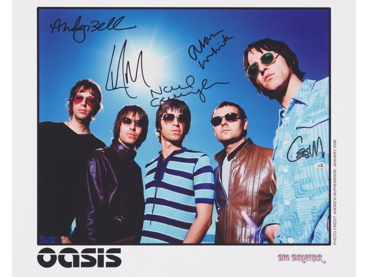 Color satin-finish 10 x 8 Big Brother publicity photo of Oasis posing outdoors under a bright sun and blue sky, signed in black felt tip by Liam Gallagher, Noel Gallagher, Alan White, Gem Archer, and Andy Bell. In very fine condition.