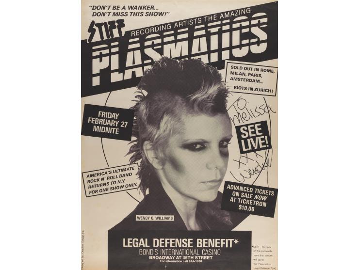 Poster for a ‘Legal Defense Benefit’ concert by The Plasmatics, 24 x 32.75, held at the Bond International Casino in New York, on February 27, 1981, featuring a large image of controversial frontwoman Wendy O. Williams, signed and inscribed in black felt tip, “To Melissa, xxx Wendy.” Rolled and in fine condition, with minor creasing and short tears to the top and bottom edges.