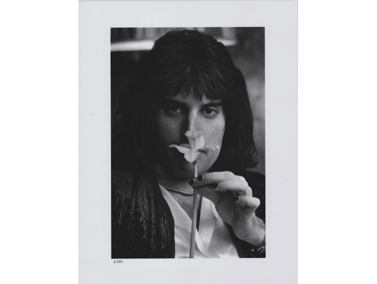 Limited edition satin-finish 17 x 22 photographic print of Freddie Mercury holding a daffodil in a close-up pose, taken by photographer Laurens Van Houten, hand-numbered 6/50, with a "You-Neek" blindstamp at lower left. In fine condition.
