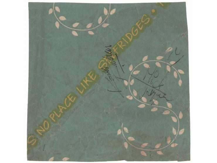 Vintage fountain pen signatures, "Mick Jagger" and "Keith Richard,” on a 6.5 x 6.5 piece of Selfridge's paper. In very good to fine condition, with overall creasing. Accompanied by a full letter of authenticity from Beckett Authentication Services.